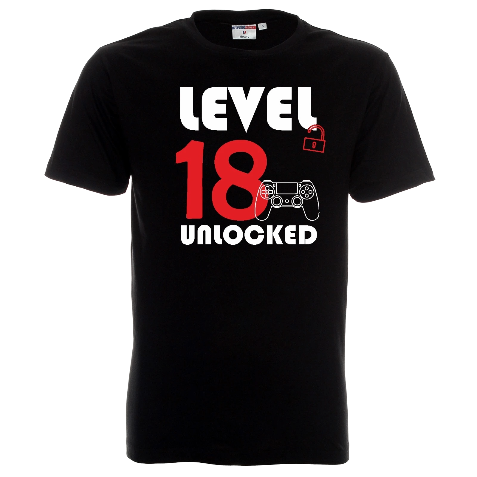 LEVEL 18 UNLOCKED – czerwono-biały napis + grafika pada do gier i kłódki – w stylu retro/gamer